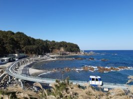 이 레일은 바다 위를 달리는 모노레일입니다. 단산 모노레일은 8인승인데 죽변 해안 스카이 레일은 4인승입니다. 장점은 4인승이니까 일행끼리만 탈 수 있다는 점이죠. 두 명이서 가면 두 명이 탈 수 있습니다. 대신 모노레일 가격은 1인 가격이 아니라 모노레일당 가격입니다. 여기를 주말에 갔었는데 사람들이 너무 많아서 대기 시간이 거의 1시간 30분을 기다려야 했어요. 그래도 장점이 있습니다. 이 주변에 죽변 등대공원, 드라마 ‘폭풍 속으로’ 드라마 세트장, 하트해변, 죽변 등대 등 1시간 내로 볼 수 있는 볼거리가 많다는 점입니다. 모노레일을 매표한 후 이러한 볼거리를 다 구경한 다음에 가서 탑승하면 됩니다. 주변 해양 스카이레일의 사진 포토존은 모노레일 안에서 찍은 것보다 드라마 세트장에서 바라본 하트해변 또는 모노레일과 함께 찍은 것을 추천합니다.